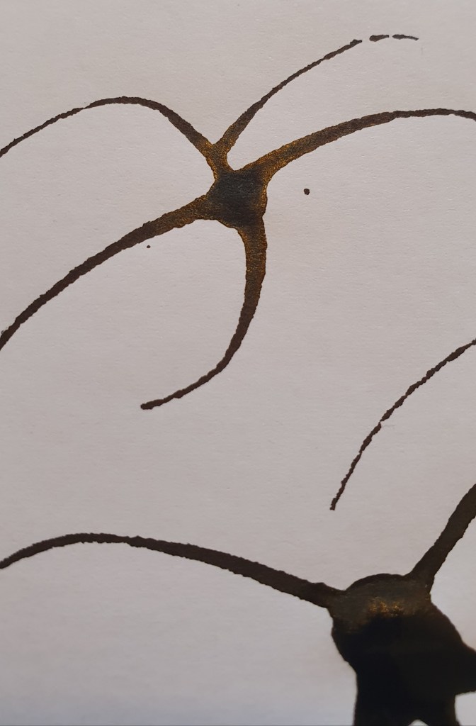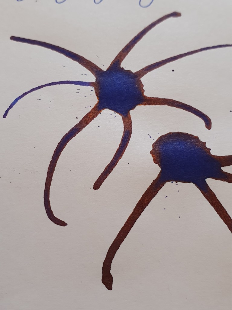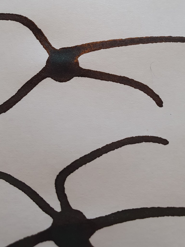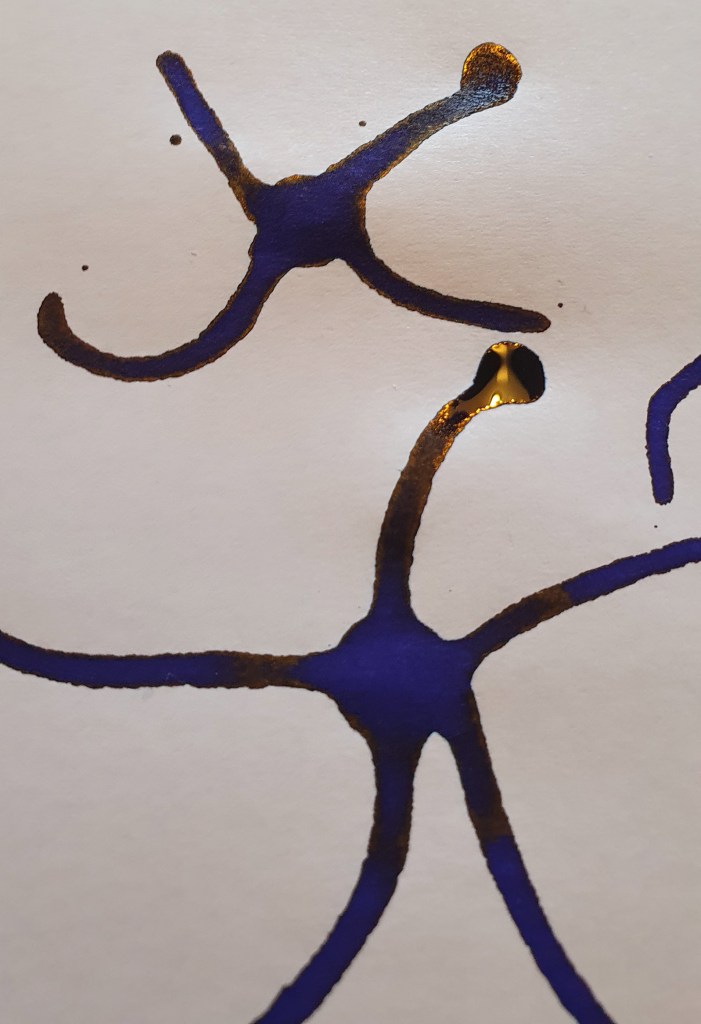 I still don’t quite know how I feel about this ink. There is nothing wrong with it as such. Indeed, the ink is well behaved: it is neither too wet or too dry, it doesn’t feather, doesn’t show through and doesn’t stain. It’s just, I’m not keen on what is called ‘blurple’ – a self explanatory portmanteau of blue and purple. I love blue inks, it’s probably my favourite colour ink; I also like purple inks, too. It’s just, I don’t like blurple. On the other hand, the golden sheen it possesses is just amazing. It’s not a heavy sheener, but its subtlety makes it that little bit more special. Sometimes the clue isn’t in the title, but in this one it was.