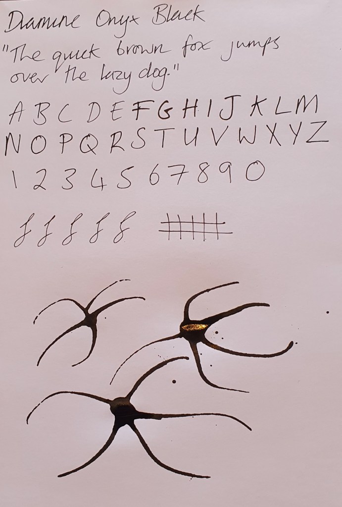 Is black always black? One of the strange things about collecting fountain pen inks is that you become more aware of the differences between different colours. Pre-fountain pen me might have noticed that a particular pen’s colour was different to another brand’s corresponding colour, I may even have noticed that some inks were darker than others, but I think that is where my observations and interest ended. While Onyx Black is undeniably black, it’s also purpley to my eyes and it has a rich, greeny-golden beetle like iridescent sheen.