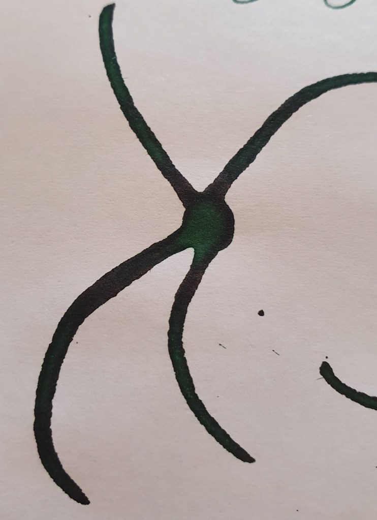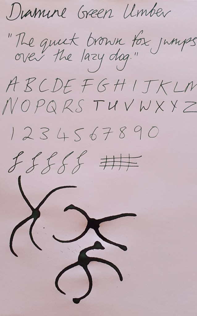 Sometimes the old adage, “it’s not you, it’s me”, really does ring true. That is the case with Diamine Green Umber. There is nothing wrong with this ink, really. It is just a plain, green. It isn’t a dark green, nor is it a light green. I have heard it described as an old earth natural green. Unfortunately, it just does nothing for me. I have yet to experience any real sheen or shading with this ink when writing. In ink splats, a small amount of darker shading can be observed. Definitely not one to use on cheaper paper.