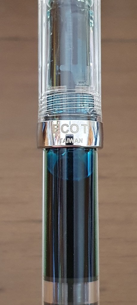 First of all, and probably one my number one concerns when choosing a new pen, is how it looks. The Eco and Eco-T look fantastic, to me. Opting for the fully transparent version, I love(d) the clean lines and the simplicity of the design. It is made from a single piece of durable high grade plastic. There is a minimalism to the pen that seems to scoff at the more aesthetic and mechanical complexity of some higher priced pens. Not that more intricate designs are necessarily a bad thing, it’s just that there is an appeal to the honesty and unabashed lack of pretentiousness featured in the Eco and Eco-T. The smooth screw-on cap sports a stainless steel cap ring and clip, which complement the overall design ethos, as well as a red TWSBI logo cap finial.